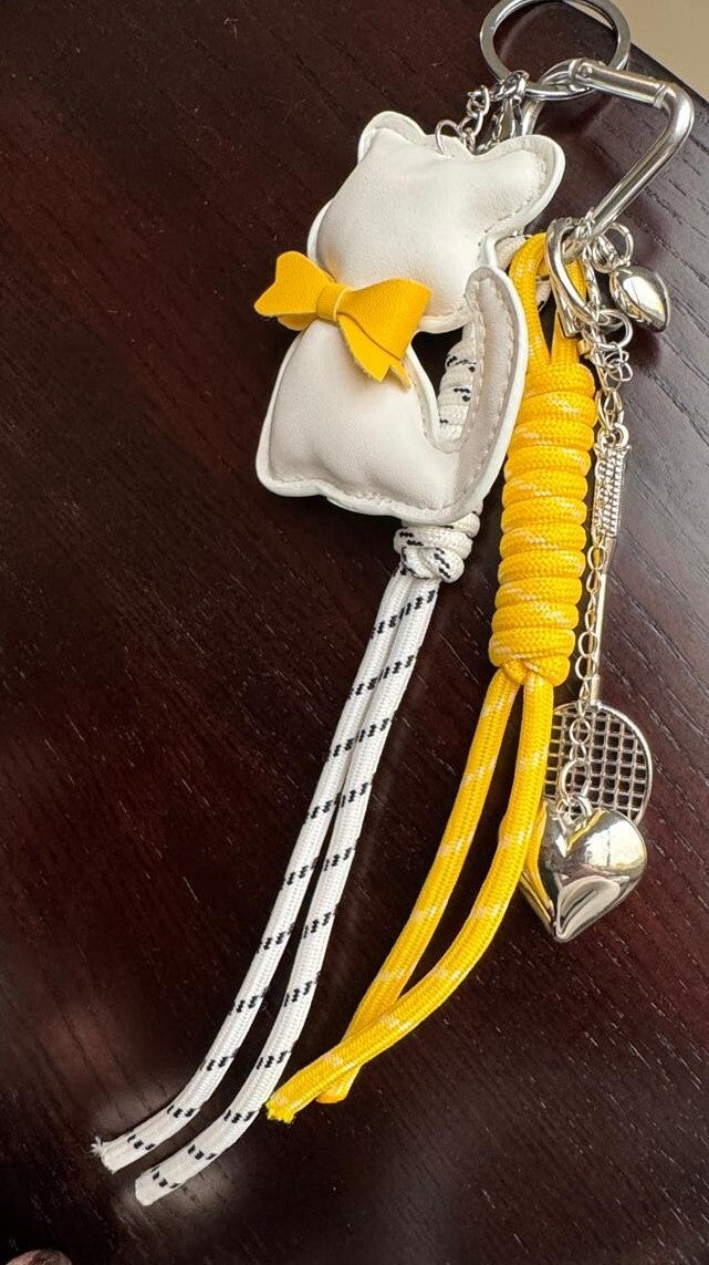 Featuring a chic cat silhouette, yellow bow detail, a metallic tennis racket, and metallic heart charm, this collectible piece adds a stylish statement to any handbag or key set.